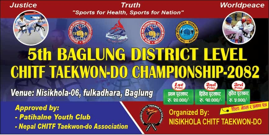 we are excited to extend a cordial invitation to you and your esteemed students on behalf of the baglung chitf taekwon-do Association . we are thrilled to invite you to participate in the prestigious 5th baglung District level chitf taekwon-do championship- 2082. this grand event is scheduled to take place from 03rd October to 04th October 2025, at the Nisikhola-06 fulkadhara, baglung